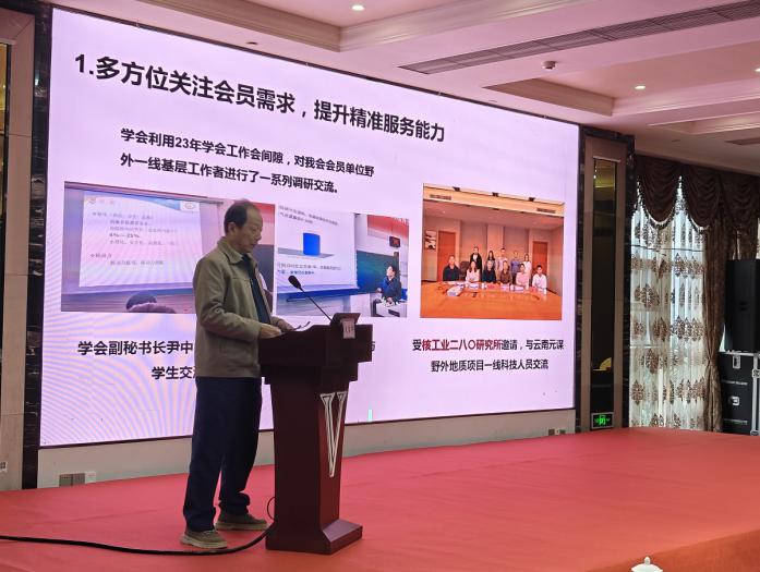 陈东辉理事长发表会议总结,他指出,2023年是学会发展历程中极为重要的一年,学会各项工作也取得了良好的成绩。在看到工作成效的同时,我们也深刻认识到了不足之处。未来需要进一步提升创新发展意识,加强精准服务广大会员的能力;适应新时代地质工作新要求,进一步加强助力地方发展战略、服务经济社会发展等方面工作;继续加强人才队伍建设,进一步加大支撑学会高质量发展的人才动能。