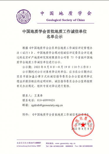 近日,中国地质学会官网正式发布四大奖项、第十八届青年地质科技奖——金银锤奖初评结果、第五届野外青年地质贡献奖——金罗盘奖评选结果、首批地质工作诚信单位、第三批地学科普研学基地(营地)以及第二批精品地学研学路线、第一批精品地学研学课程评选结果的公示。其中,由我会推荐入选的奖项分别为: