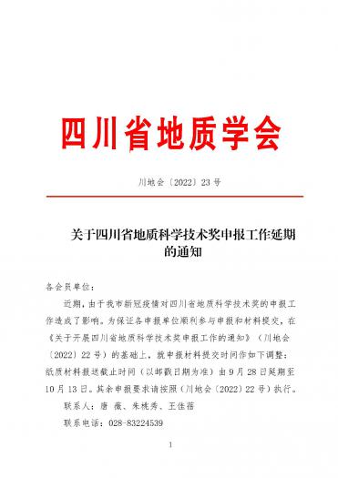近期,由于我市新冠疫情对四川省地质科学技术奖的申报工作造成了影响。为保证各申报单位顺利参与申报和材料提交,在《关于开展四川省地质科学技术奖申报工作的通知》(川地会〔2022〕22号)的基础上,就申报材料提交时间作如下调整:纸质材料报送截止时间(以邮戳日期为准)由9月28日延期至10月13日。其余申报要求请按照(川地会〔2022〕22号)执行。