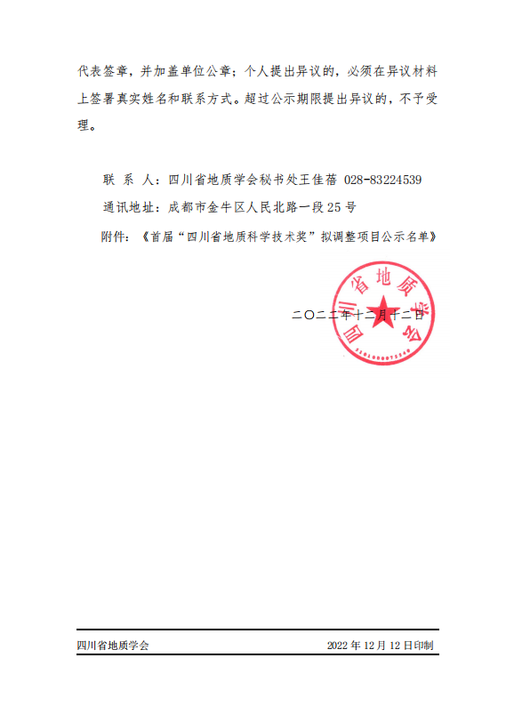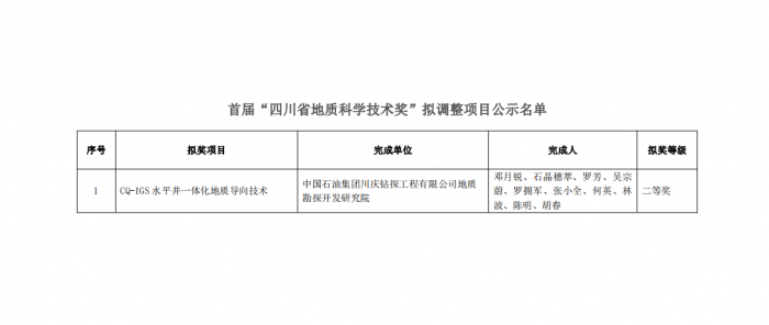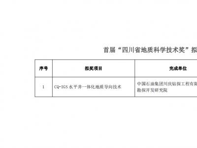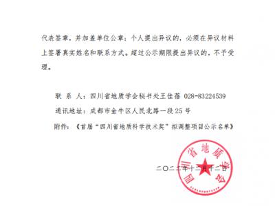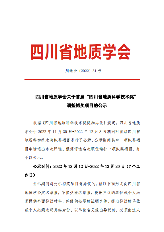 四川省地质学会关于首届“四川省地质科学技术奖” 调整拟奖项目的公示