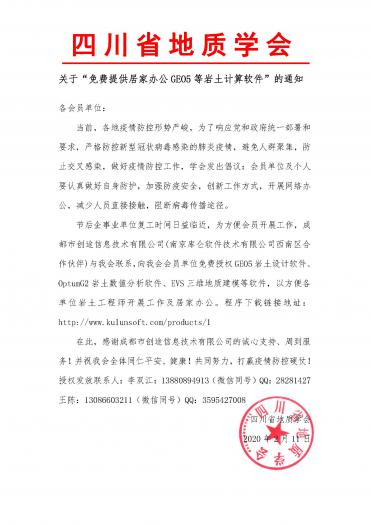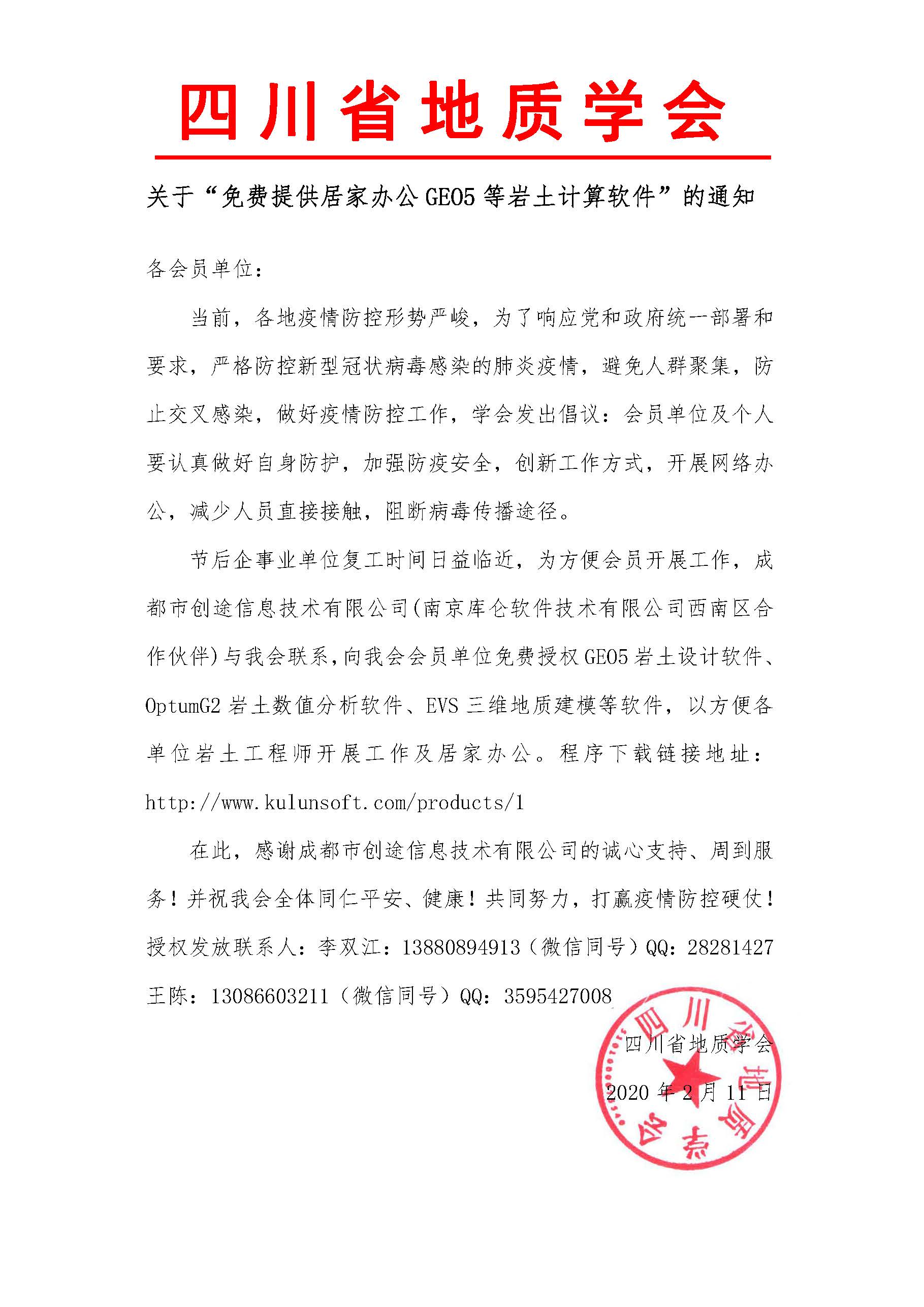 节后企事业单位复工时间日益临近,为方便会员开展工作,成都市创途信息技术有限公司(南京库仑软件技术有限公司西南区合作伙伴)与我会联系,向我会会员单位免费授权GEO5岩土设计软件、OptumG2岩土数值分析软件、EVS三维地质建模等软件,以方便各单位岩土工程师开展工作及居家办公。程序下载链接地址:http://www.kulunsoft.com/products/1