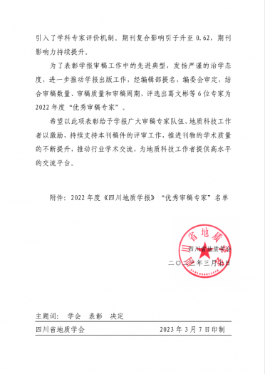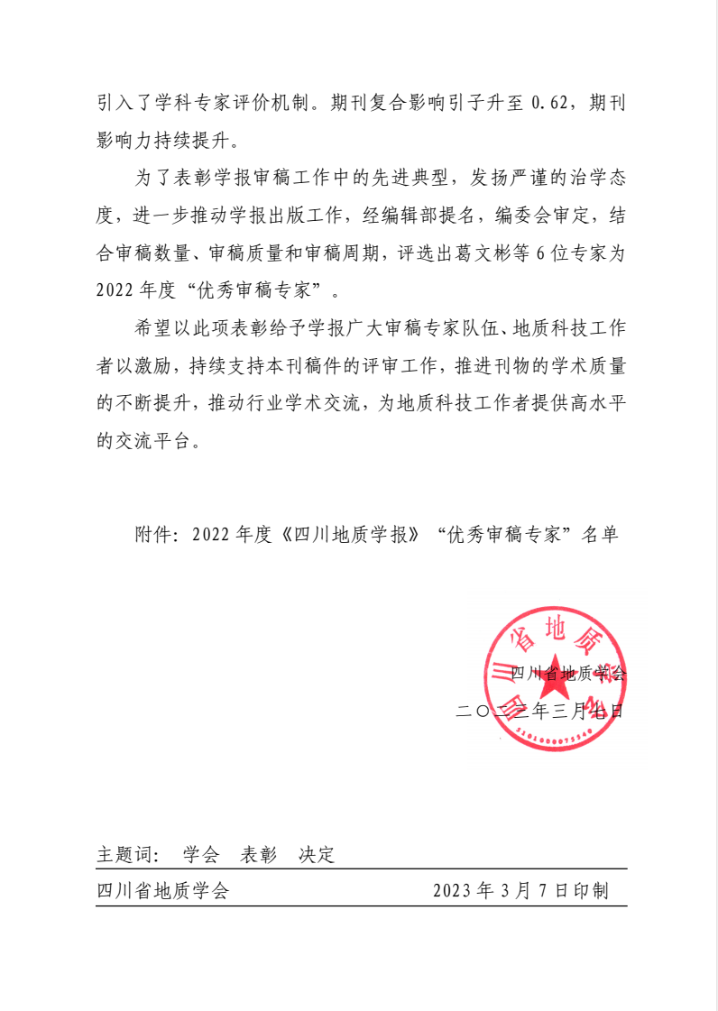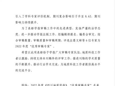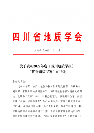 关于表彰2022年度《四川地质学报》优秀审稿专家的决定
