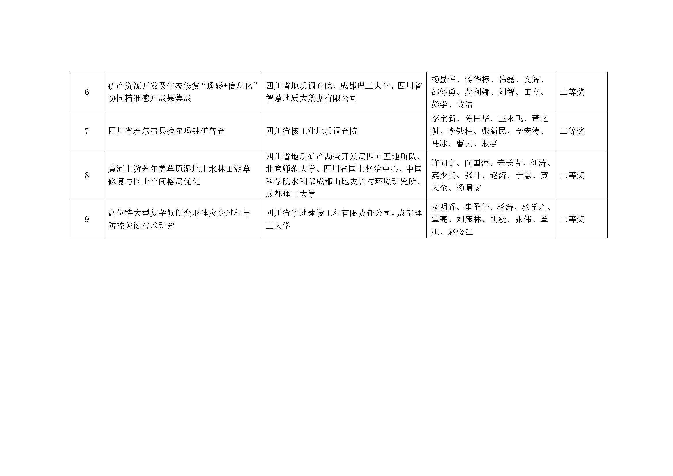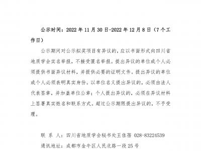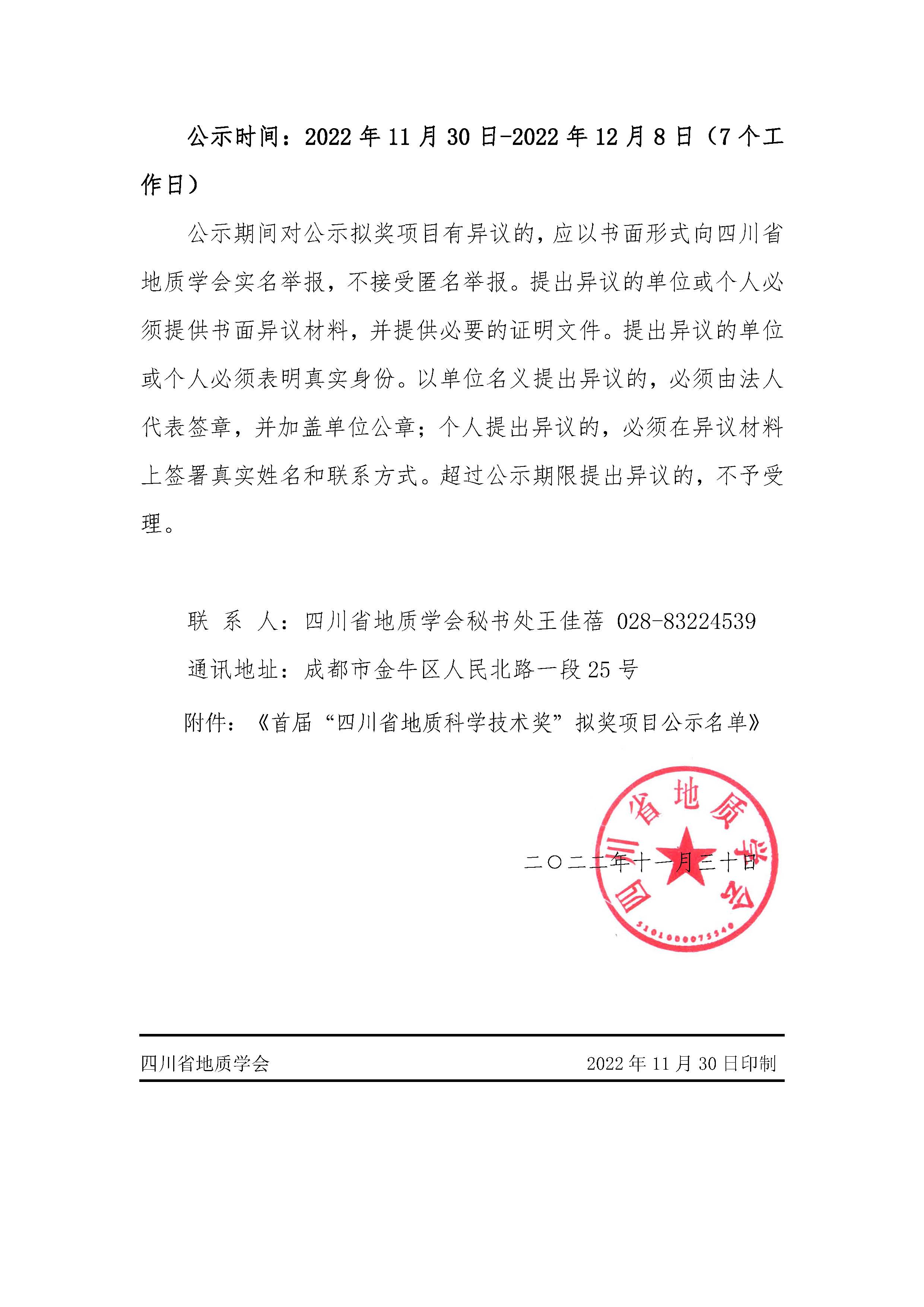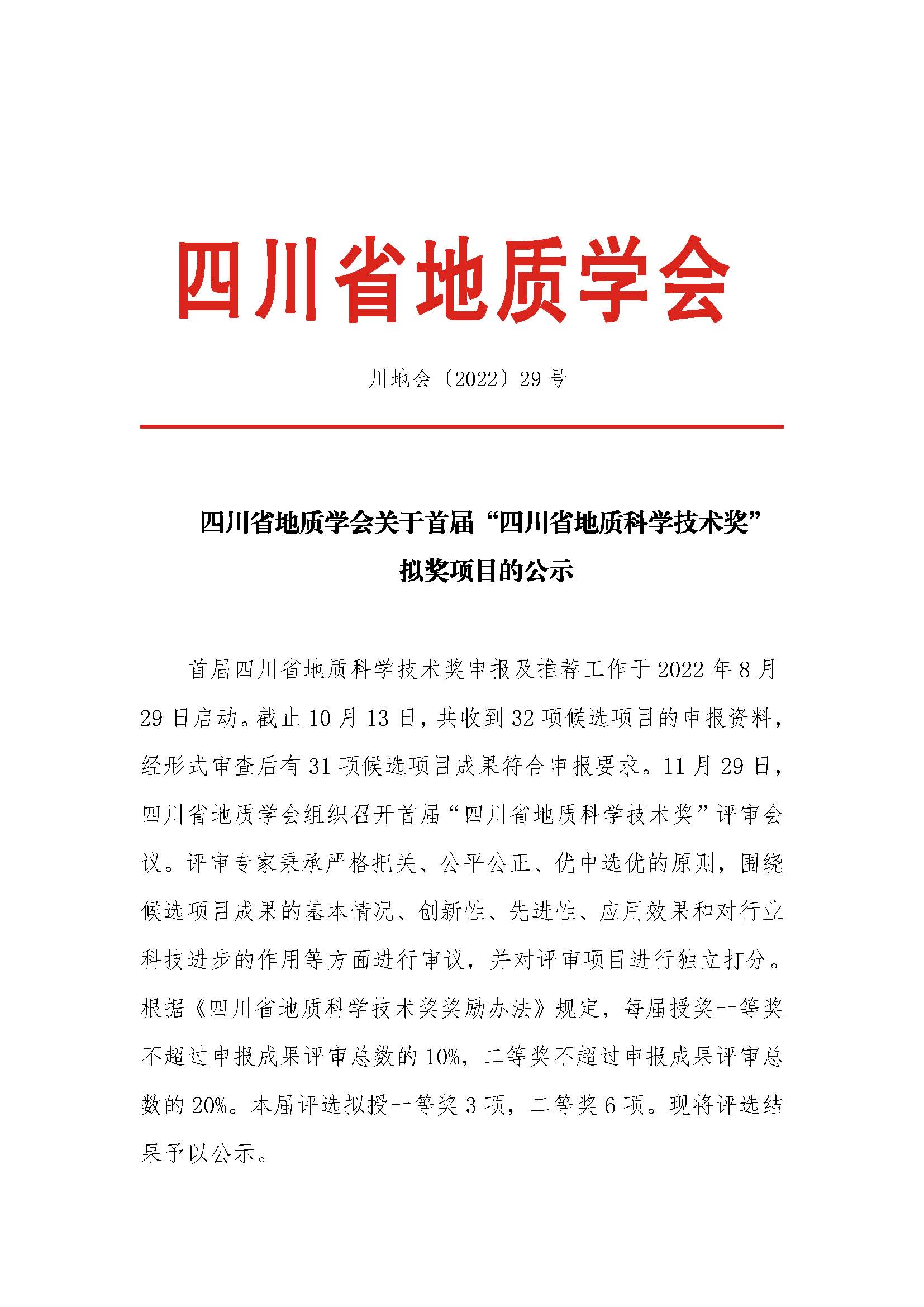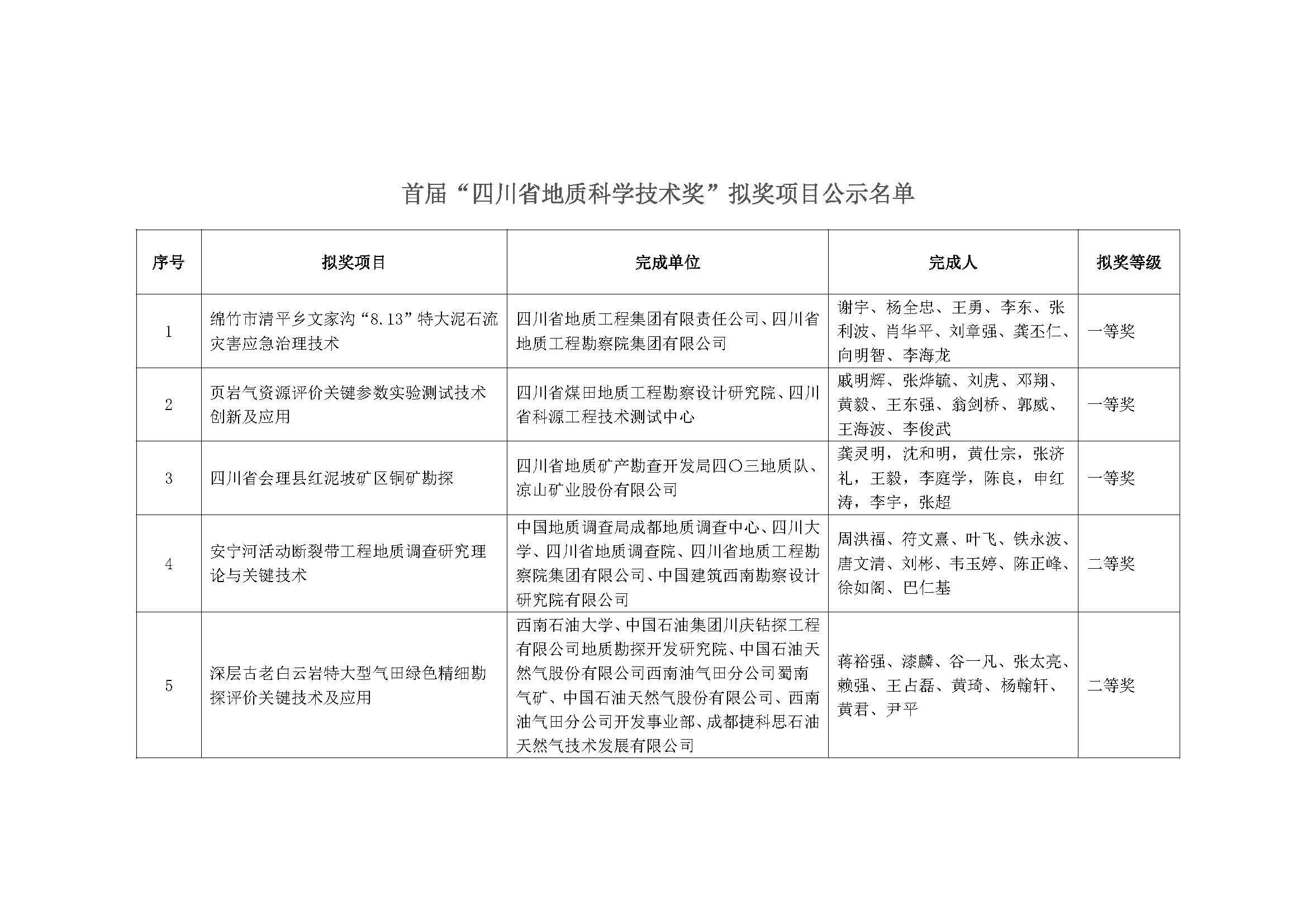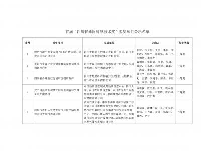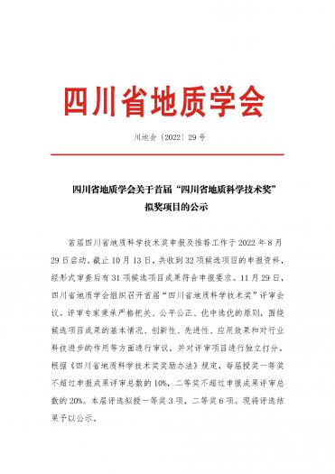 四川省地质学会关于首届“四川省地质科学技术奖”拟奖项目的公示