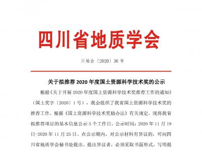 四川省地质学会关于拟推荐2020年度国土资源科学技术奖的公示